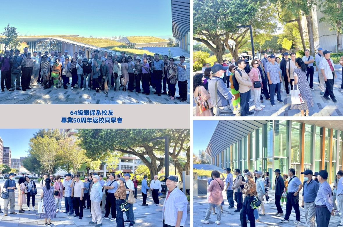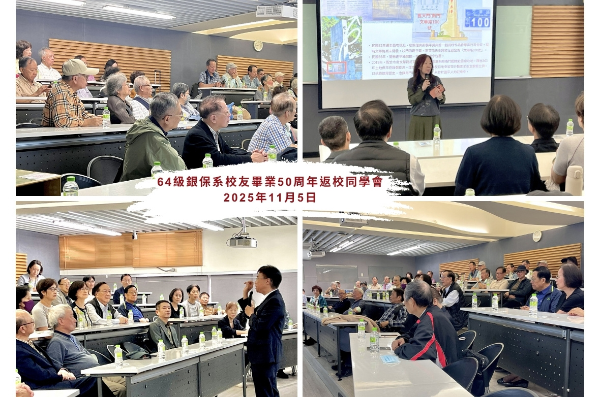 今年適逢64級銀行保險學系校友畢業五十周年,校友們一行約50人於11月5日至6日擴大舉辦聯合同學會。活動首日由金融學院協助規劃返校行程,安排播放64級老照片與共善樓影片、座談交流及校園導覽,讓校友見證母校的發展與校園擴建,重溫青春記憶。