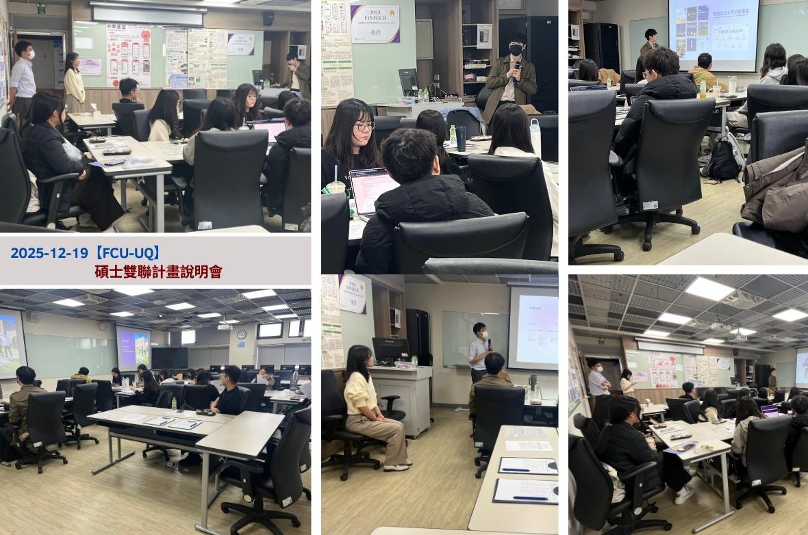 金融學院12月19日舉辦「FCU-UQ碩士雙聯說明會」,針對昆士蘭大學(UQ)碩士1+1雙聯計畫,提供申請流程、課程銜接及留學生活的完整資訊,協助學生順利踏上國際舞台。